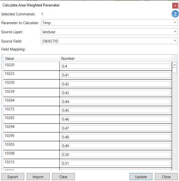 In some cases, model parameters are available in GIS layers. The Calculate Area Weighted tool reads the parameter values, calculate the area weighted value if necessary and then assign to catchments. The imperviousness (TIMP and XIMP) and initial abstraction are two parameters that can utilize this tool. To use this tool: