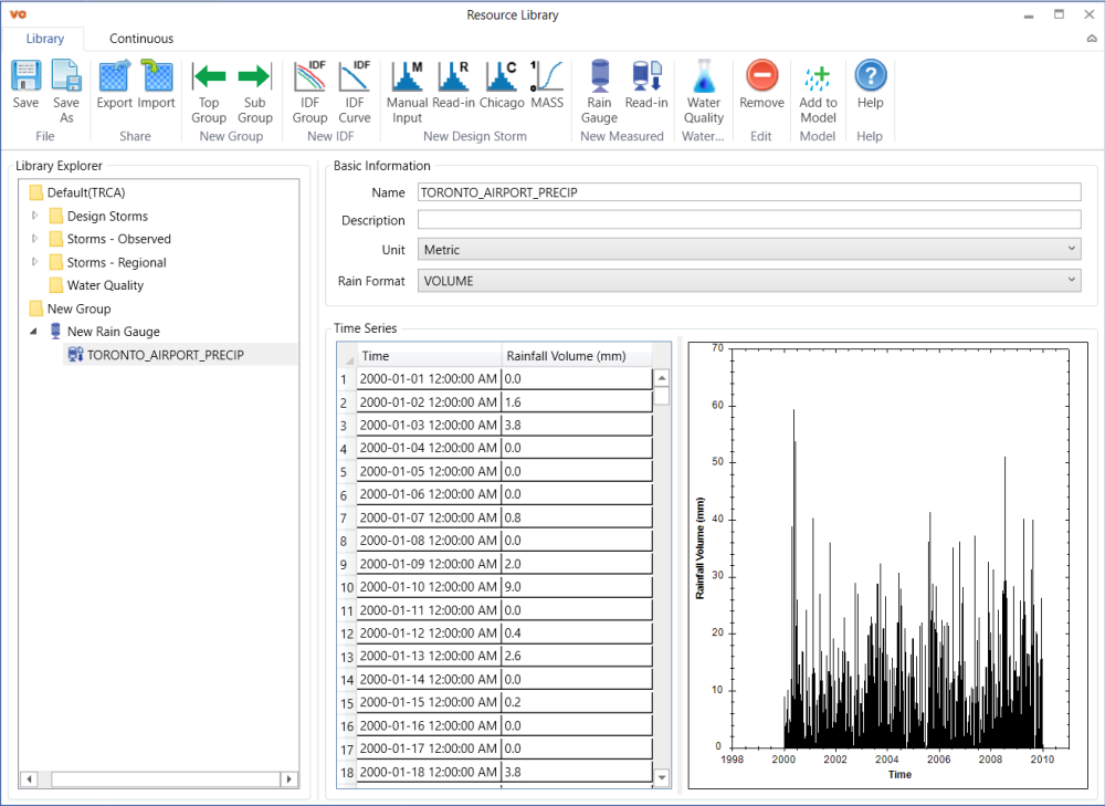 Although data from any time step can be added to the library, the continuous simulation only sup-ports certain time steps. For precipitation, it is 5min, 10min, 15min, 20min, 1hr and 1day. For temperature and evaporation, it is 1day. The format of climate data files can be found in 10.2 Climate Data Files.