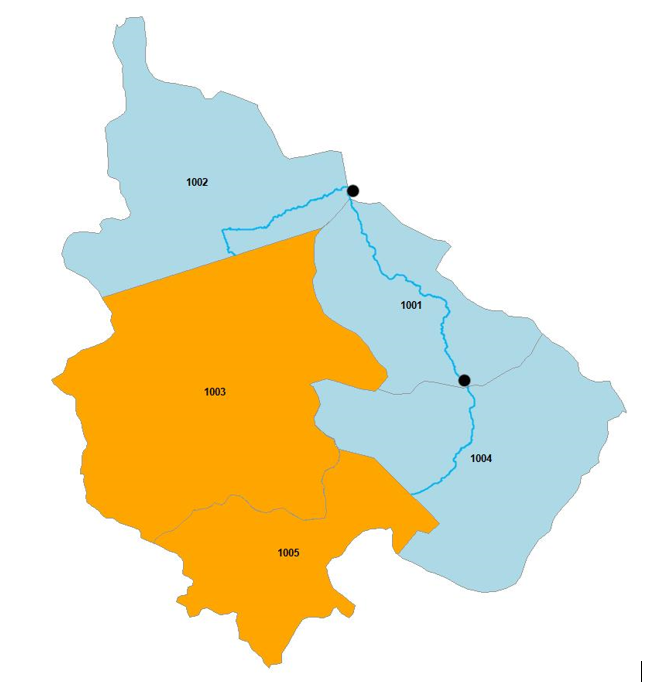 In this exercise, we will create a VO model for the watershed shown below. It has two urban sub-catchment (1003 and 1005) and three rural sub-catchments (1001, 1002 and 1004).