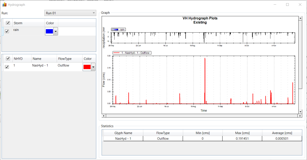 Hydrograph button give the hydrograph graph versus the rain fall data. Select from the drop-down list of Run to choose the desired run.