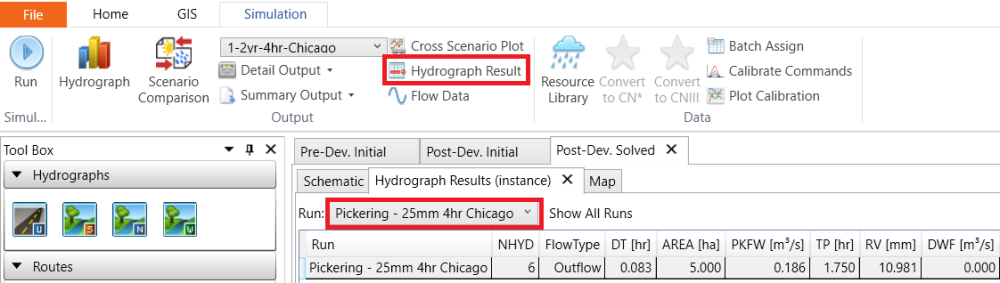 The Rain Garden is designed to capture runoff from a 25 mm storm event “Pickering – 25mm 4hr Chicago”. To size the Rain Garden, we need to know how many cubic meters of runoff coming to the Rain Garden from the upstream command, which is CompoundChannel – 6 in this exercise. We will get this by multiplying the runoff volume and the area of CompoundChannel – 6 .