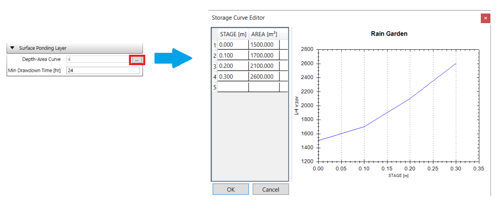 Storage in the Rain Garden is a combination of the storage in the Surface Ponding Layer and in the Engineered Soil Layer. Click the button next to Depth-Area Curve in the Properties menu, and type in the stage and area values as shown in the figure below.