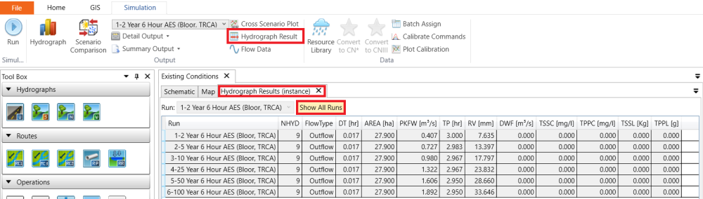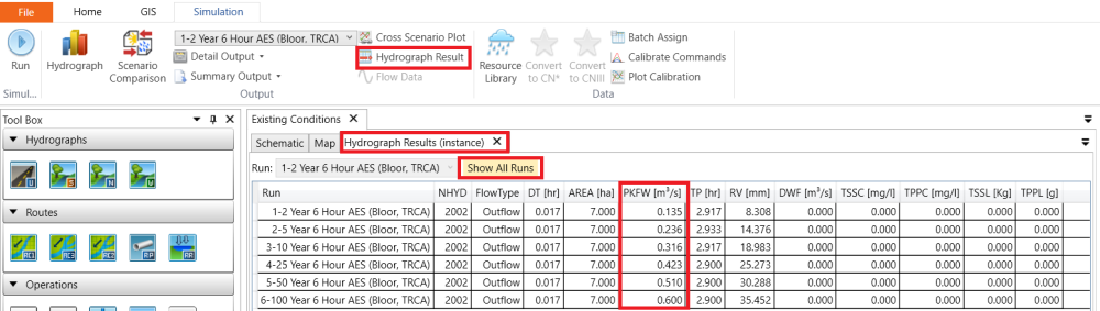 Click on the RouteChannel 2002 on the schematic canvas and the select Hydrograph Result in the Simulation tab. Under the Hydrograph Results (Instantce) tab, click on Show All Runs and a summary of calculated hydrograph results for each design storm will appear in the table. Write down the peak flow PKFW and those values will be used later as target peak flows for pond sizing.