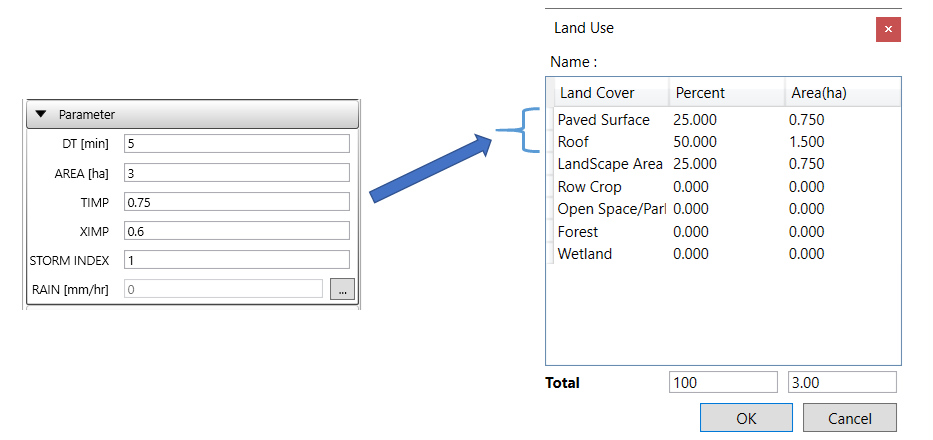 Look at the percent impervious ratios (i.e. TIMP and XIMP) and the assigned LandUse for the three StandHyd commands in the Properties menu. The impervious ratios and the LandUse are defined separately, so it is important to check by yourself that the LandUse and the impervious ratio make sense. For instance, for the Residential Subdivision 2, the sum of paved surface (25%) and roof (50%) is equal to the total impervious ratio (TIMP, 70%) and larger than the directly connected impervious ratio (XIMP, 60%). The 60% XIMP can be interpreted as the sum of all paved surface (25%) and a part of roof (35%, which is reasonable for town homes). In other words, the other part of roof (15%) is considered as indirectly connected impervious area.