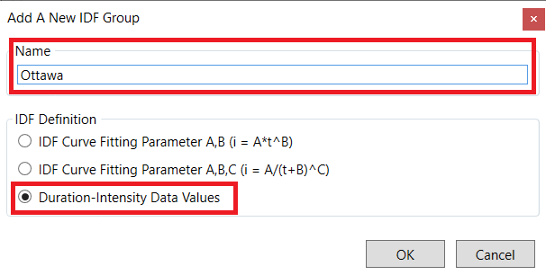 The Add A New IDF Group window will pop up. Enter the name as “Ottawa” and select the Duration-Intensity Data Values. Then click OK button.