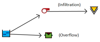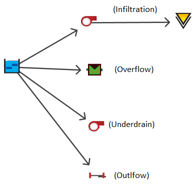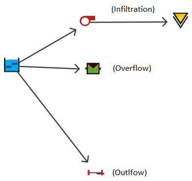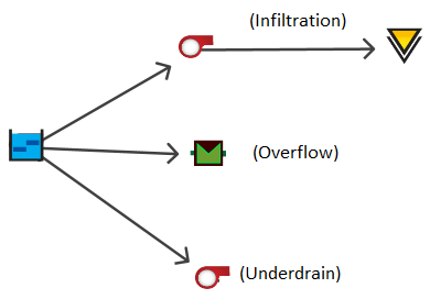 Storage Unit with a Pump followed by an Outfall, a Weir and if applicable another Pump and a Conduit. The Storage Unit is used to model the main structure of Chamber. The first Pump and the followed Outfall are used to model the infiltration from the Chamber. The Weir is used to model the Overflow. The Type of the Weir is Transverse and the Height and Width of Weir use the default value 1 as in VOSWMM. Users should check these settings and make adjustment if needed. If the Chamber has Underdrain modeled, another Pump is added to model the Underdrain. If the Chamber has Outflow modeled, a circular Conduit with a diameter of 1 and a length of 50 is added to model the Outflow. Users should check these settings and make adjustment if needed.