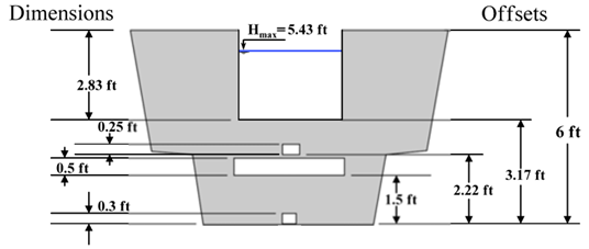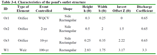 The final VOSWMM model, including the detention pond, is presented in Figure 3-9 with the input file named Example3.inp. Table 3-4 summarizes discharge elements in the pond’s outlet, detailed in Figure 3-10.