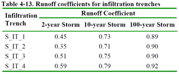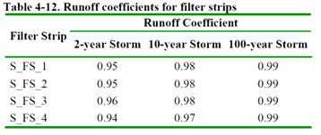 The complete model, with all LIDs included, is in the file Example4.inp. It was simulated using Dynamic Wave flow routing with specific time steps for wet runoff, reporting, and routing. Figures 4-8 and 4-9 compare influent and effluent runoff for filter strip S_FS_1 and infiltration trench S_IT_1, while similar results are observed for other LIDs. Tables 4-12 and 4-13 list runoff coefficients for filter strips and infiltration trenches, representing the fraction of effluent-runoff volume to influent-runoff volume. The reduction in runoff volume provided by the LID can be calculated as 1 minus the runoff coefficient.