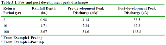 Table 3-1 outlines discharges managed by the pond, based on Example 1’s pre-development peaks and Example 2’s post-development peaks (Table 2-7). SWMM input files, Example1-Pre.inp and Example2-Post.inp, contain 2-, 10-, and 100-year rainfall hyetographs.