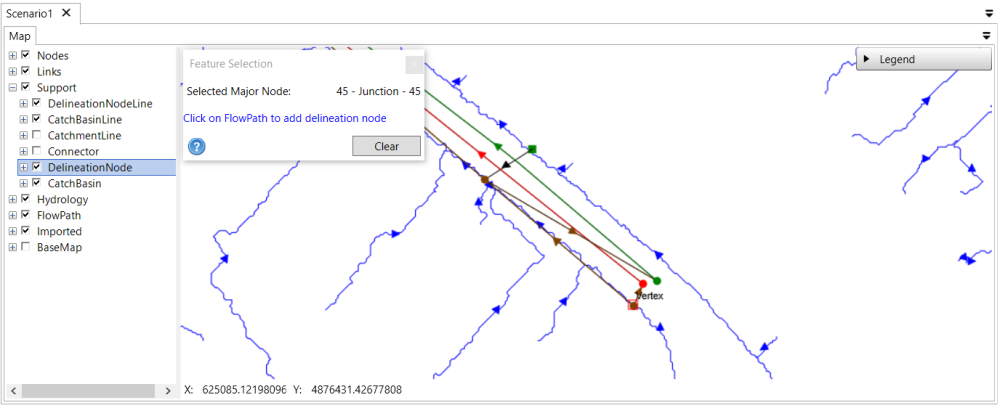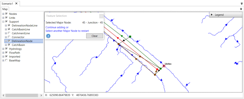 To add the delineation node for the next major Junction node, keep the Create Delineation window open. Click the desired major Junction node, check the Selected Major Node field is updated and then click on the flow path.
