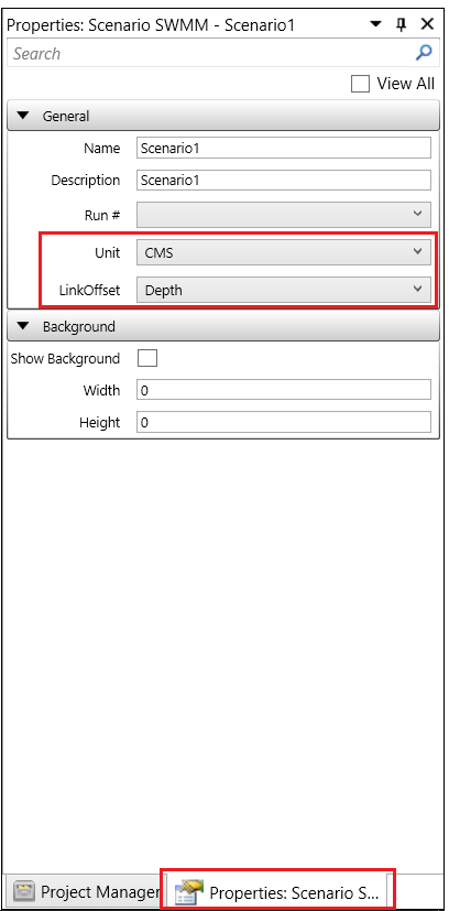 Click the Properties tab in Project Manager which by default is on the right side of the VOSWMM main interface. Make sure the Unit is set as CMS and LinkOffset as Depth.