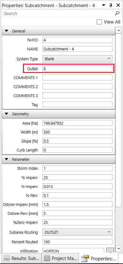 In order to connect subcatchment to a node, select Subcatchment NHYD 4. In the Properties tab, navigate to Outlet field and type the NHYD of the Node that the subcatchment is connected to. In this case, type 6.