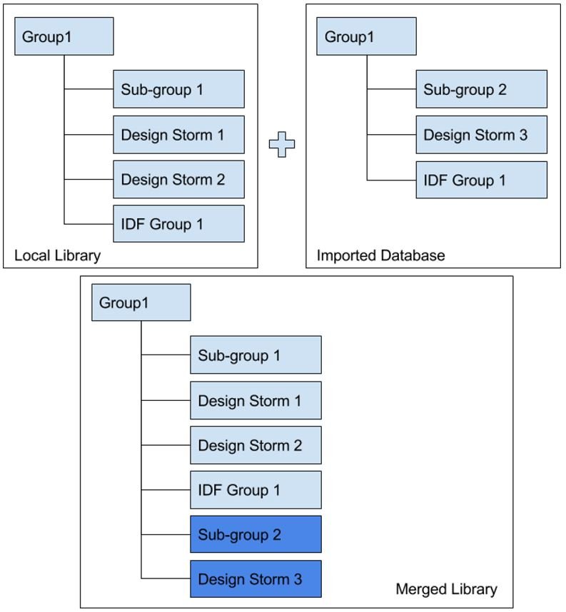 The process is demonstrated in the figure below. A merged library is generated based on the local library and the imported library. In this case, Group 1 and IDF Group 1 exists in both libraries. The one in the local library will be kept without any change even the one in imported database is different. Sub-group 2 and Design Storm 3 doesn’t exist in local library and is added into the final merged library.