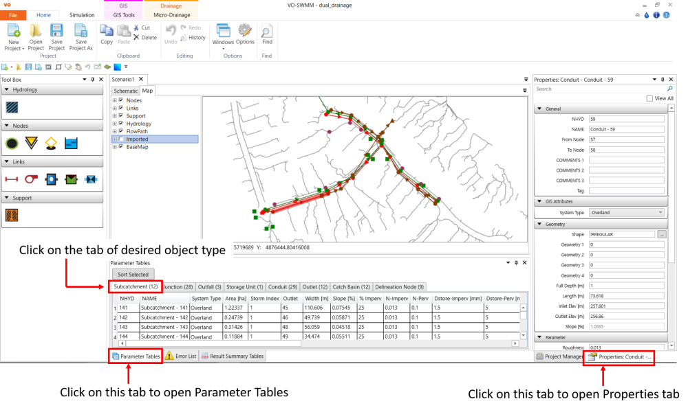 - Properties tab: By default, Properties tab is place on the right of VOSWMM main interface next to the Project Manager tab.