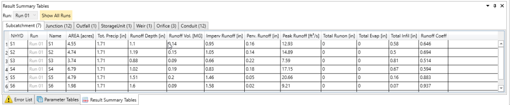 Result Summary Tables window provides a spreadsheet environment for showing/editing SWMM simulation result. By default, it’s located at the bottom of the main interface. It can be toggled on/off via Tool Bar > Home > Windows.