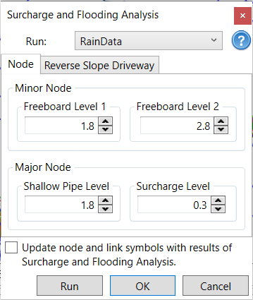 - Surcharge: the node is surcharge and the water depth is above the value given in the field Surcharge Level under the Major Node section