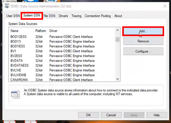 Step 3: Go to ODBC data sources 32 bits