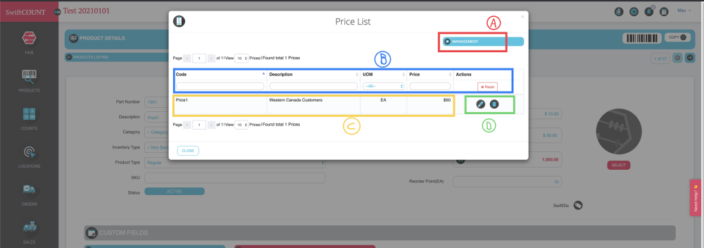 D- Action buttons. You can edit the price given to a product on a specific price list by clicking on the pencil button. You can remove the product from a specific price list by clicking on the trash can button.