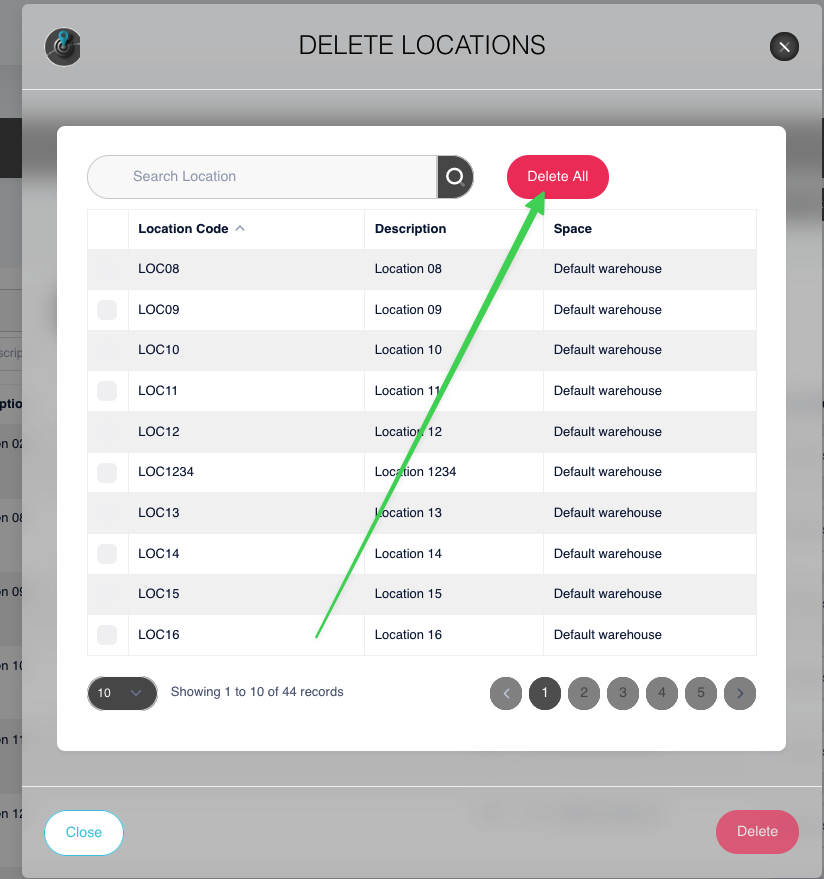 Once inside the Locations module, click the “Delete” button located at the top of the page. This will open the Mass Delete Locations interface.