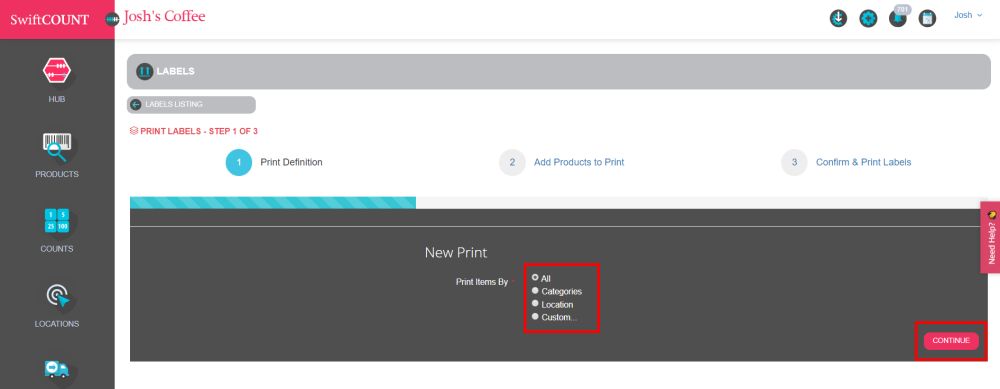 You will have different options to print barcodes : all the products, products from a specific category, products from a specific location or you can choose a few specific products by selecting them manually.