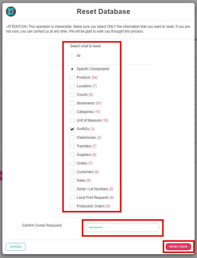 Select what to reset. You can reset all the database or only specific components as products, locations, counts, orders …
