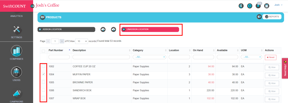 Scroll down to the products list and select the products on the list you want to unassign the location from.