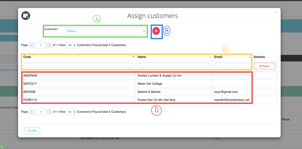 A- Customer selector. Lists all the customers in your company that have not been added to this price list.