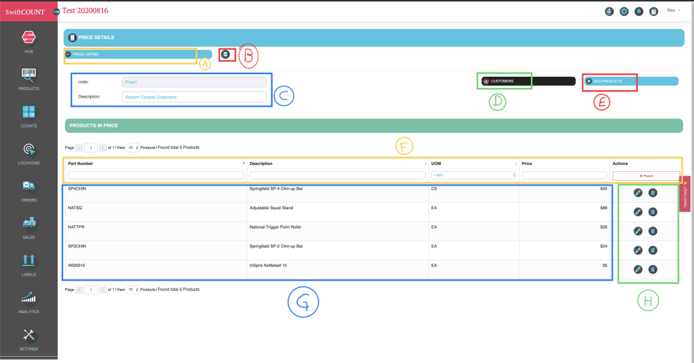 G- Products price lists details. All products assigned to the price list will be listed here.