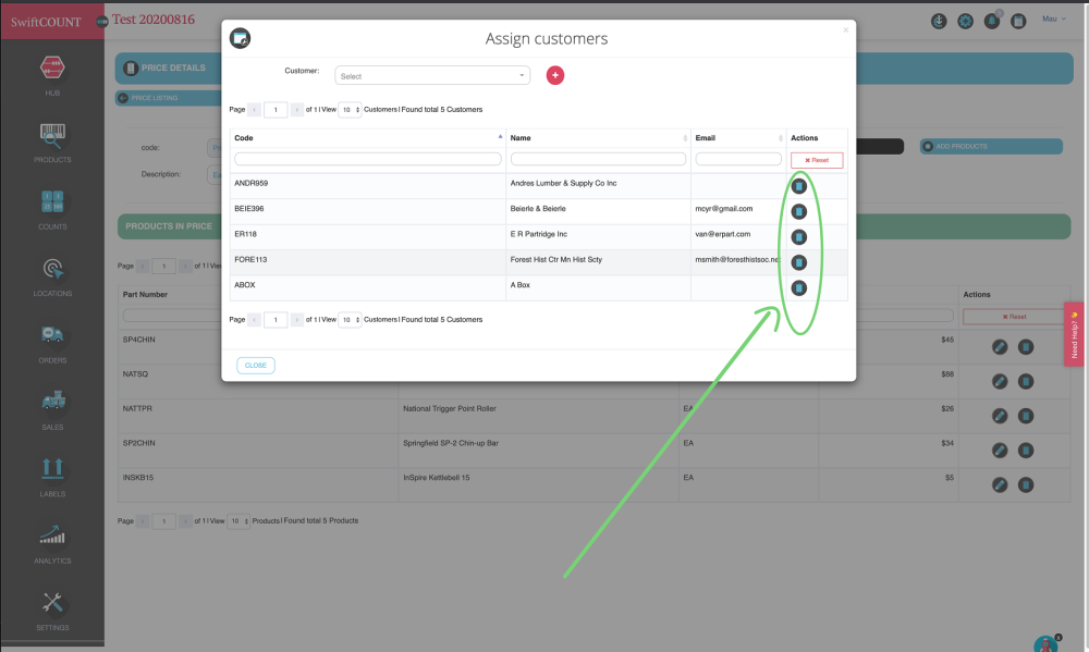You can remove a customer from a price list simply by clicking on the trash can button under Actions column besides the customer: