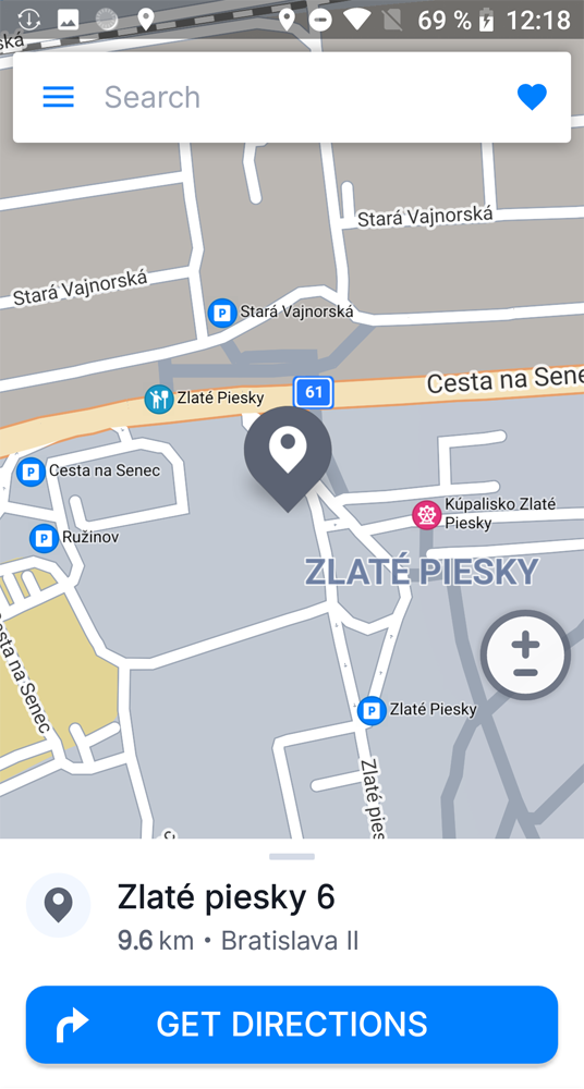 Sygic GPS Navigation by default uses your current position as the starting point when calculating a route. If you’d like to change the starting point, you can select that point either on the map by tapping on it, or finding it by using the search bar (more about the search bar is in the chapter Searching for an address) and then dragging the bottom bar with the “Get directions” button upwards. This opens up the location detail options, where you select “Set as starting point”.