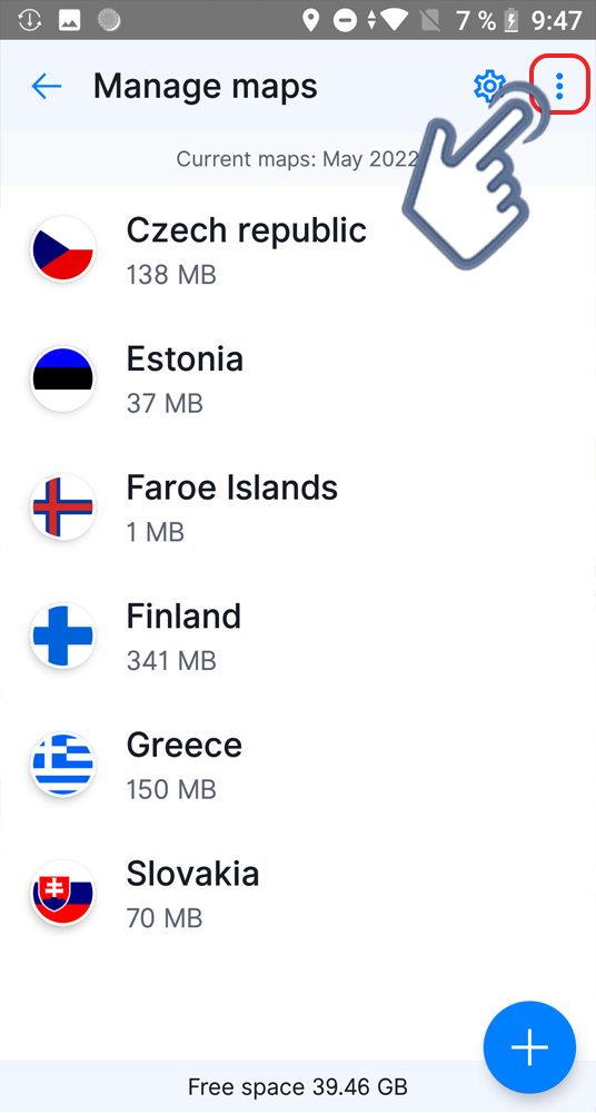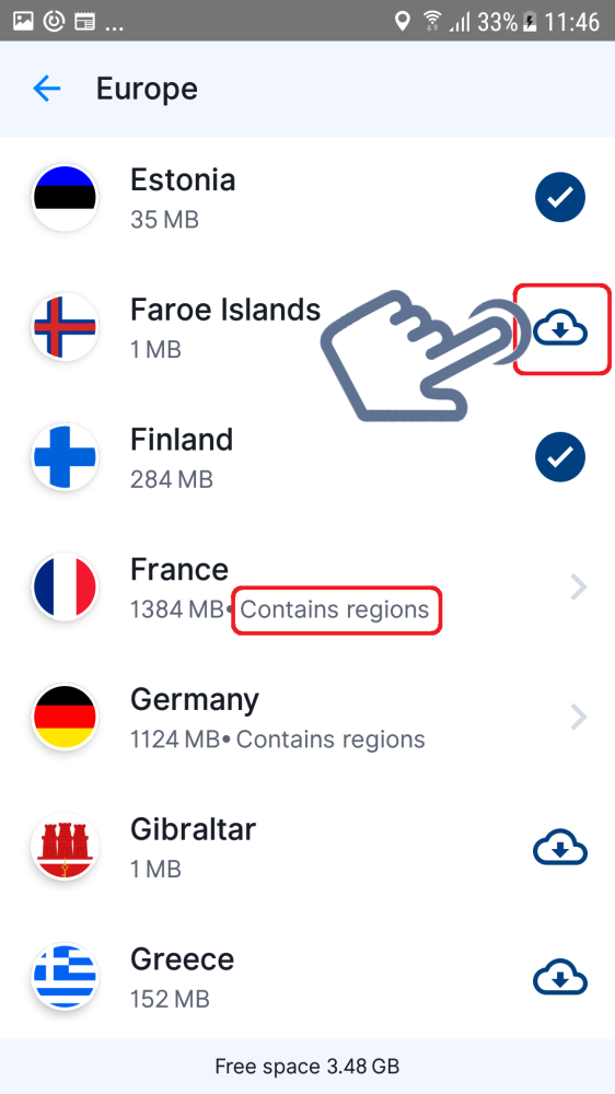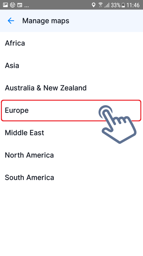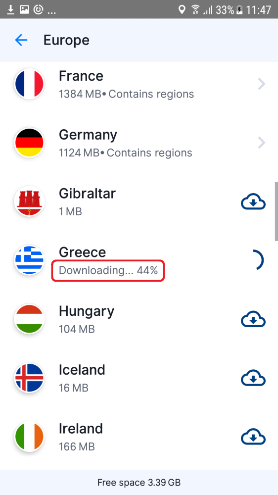 If you want to download more maps, tap on the blue PLUS “+” button in the bottom right corner of the screen. Select the continent of your desired country and then choose the particular country by tapping on it. Some large countries’ maps are divided into multiple regions which will be displayed after you tap on that country. If you would not be sure which specific regions you’ll need for your travels, then you can still simply download all of its regions by selecting the first option at the top with the name and flag of the country. Percentages under the country/region name will indicate the download progress.