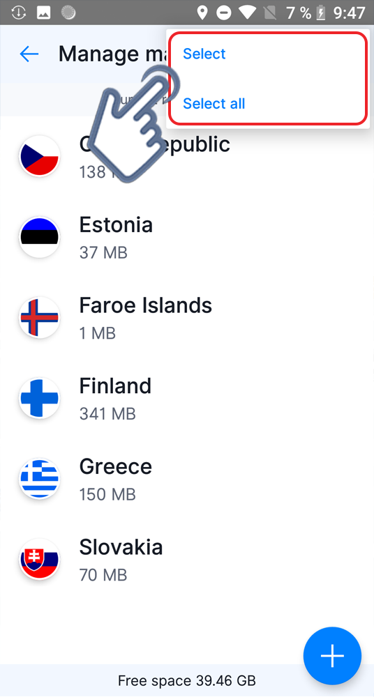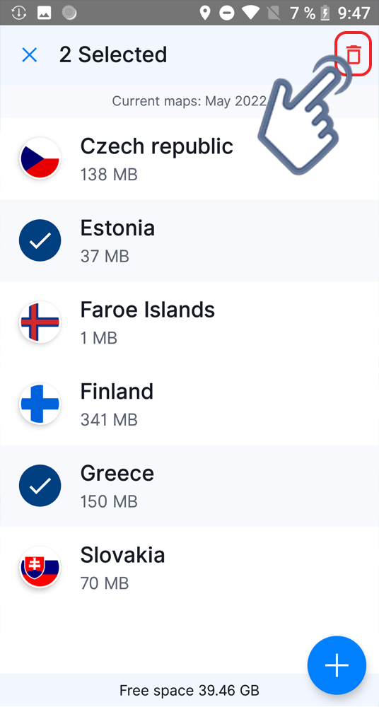 If you want to delete maps, tap and hold your finger on the maps you want to delete, or tap on the 3 dots button in the right upper corner. Options to “Select” and “Select all” will appear in the top right corner. Then just select map/maps you want to delete, and confirm by tapping on the bin icon in the top right corner.