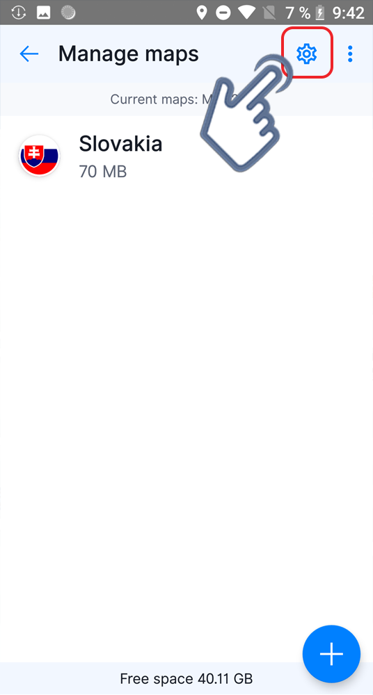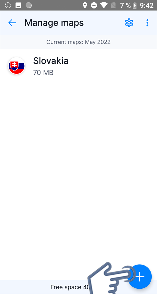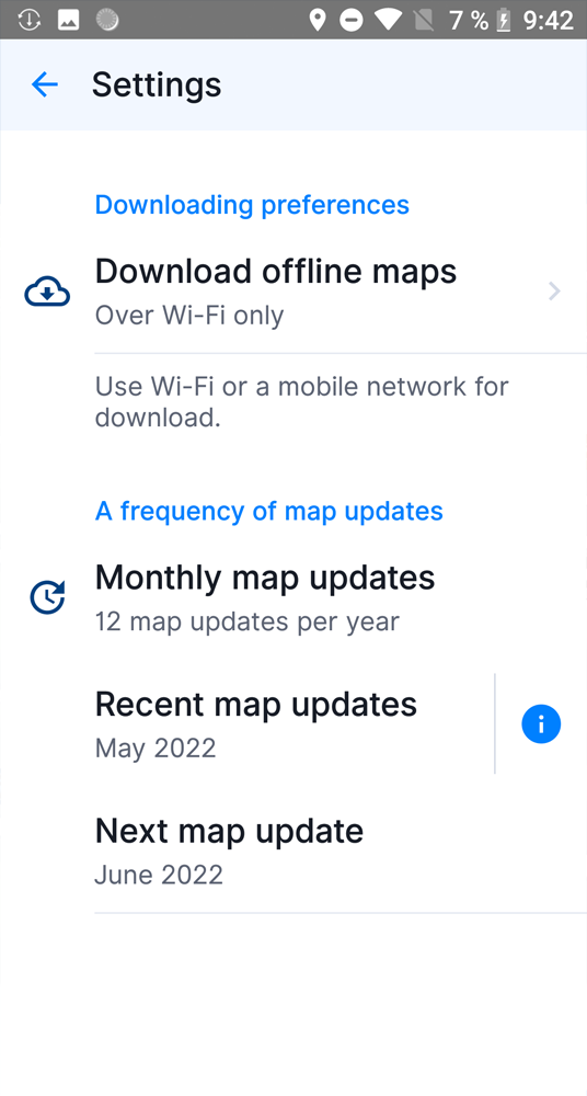 In the upper right corner you can tap on cog wheel (1), to access settings where you can set downloading preferences, and view information about previous and upcoming map releases.