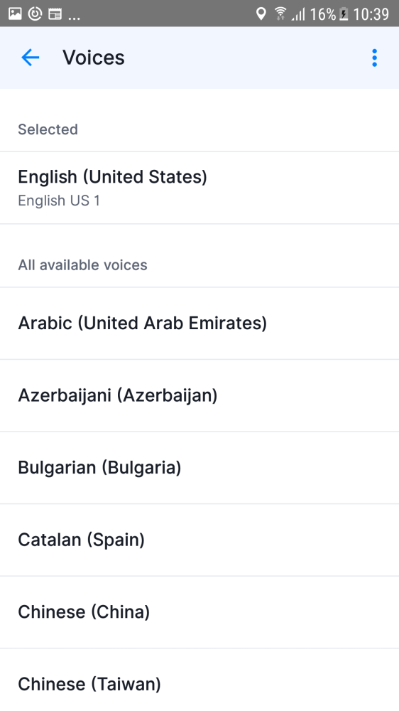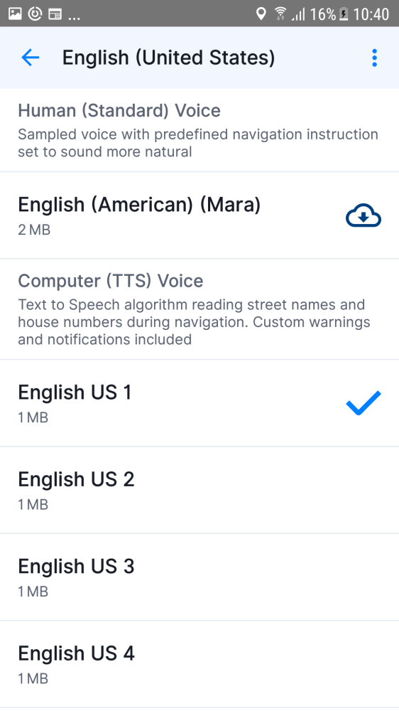 You can choose between Human (Standard) voices and Computer “text-to-speech” (TTS) voices. In the voice menu, at the top you can see which voice is currently used, and below that you can see all the other voice languages which are available to be selected. You can choose a different voice simply by tapping on the language you want to use to see if there are multiple voice options to choose from. Standard voices are provided by our Sygic app, while TTS voices are loaded from the operating system in your device, so their availability may vary.