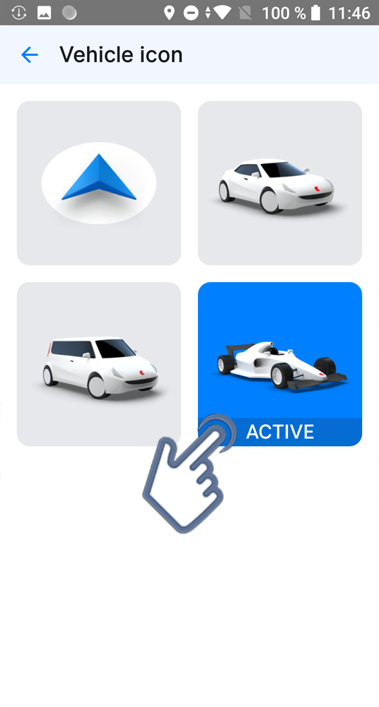To change the vehicle icon, tap on the icon that marks your current position, and choose the icon you would like to use. Currently, you can choose from car, minivan, formula, or default blue arrow.