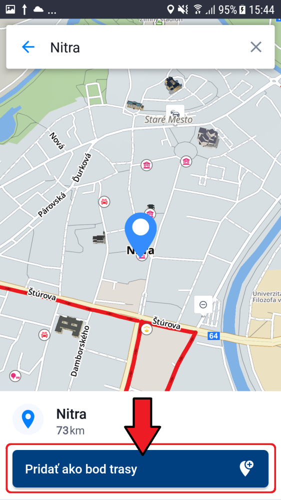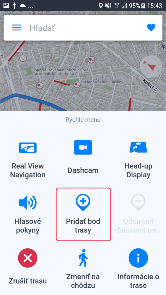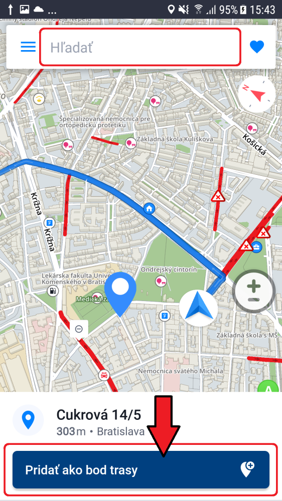 V režime navigácie oddiaľte mapu pohybom prstu po obrazovke. Kliknite na miesto na mape cez ktoré chcete prechádzať a následne potvrďte kliknutím na Pridať ako bod trasy.