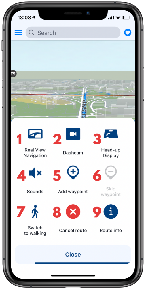 En lugar de la vista clásica en la que la ruta aparece en el mapa, la función Real View dibuja la línea de la ruta directamente sobre una secuencia en vivo de la carretera que está delante de usted, capturada por la cámara de su iPhone o iPad.