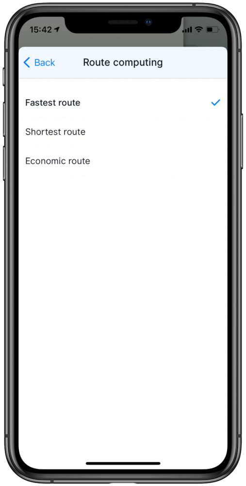 En appuyant sur* Menu→ Réglages→ Itinéraire et Navigation*, vous pouvez ajuster le type d’algorithme de calcul d’itinéraire à utiliser :