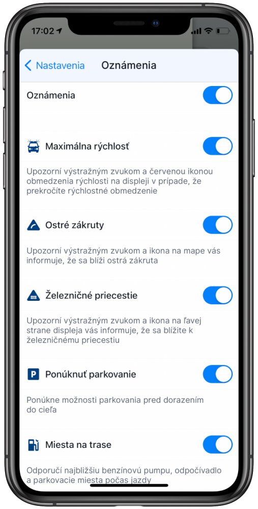 V tejto ponuke si môžete úplne vypnúť/zapnúť všetky zvuky, alebo môžete zapnúť/vypnúť oznámenia o Maximálnej rýchlosti, Upozornení na ostrú zákrutu, Železničnom priecestí, parkovacom asistentovi.