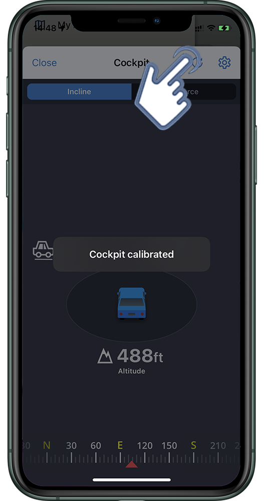 The first time you start Cockpit, a pop-up screen will inform you to mount your device into holder. Your vehicle should be stationary, on a level road without steep inclines. Pressing calibrate sets the parameters of pitch and roll to zero and measures the displayed values from that default state