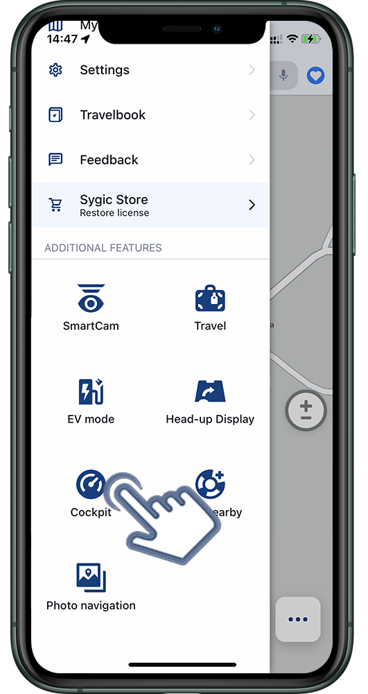 The cogwheel icon in the top right corner lets you enable the feature for viewing data from the Cockpit feature in the Information bar which is at the bottom of the screen while you are navigating. You can then switch between different kinds of information being displayed there, by swiping left or right within that Information bar.