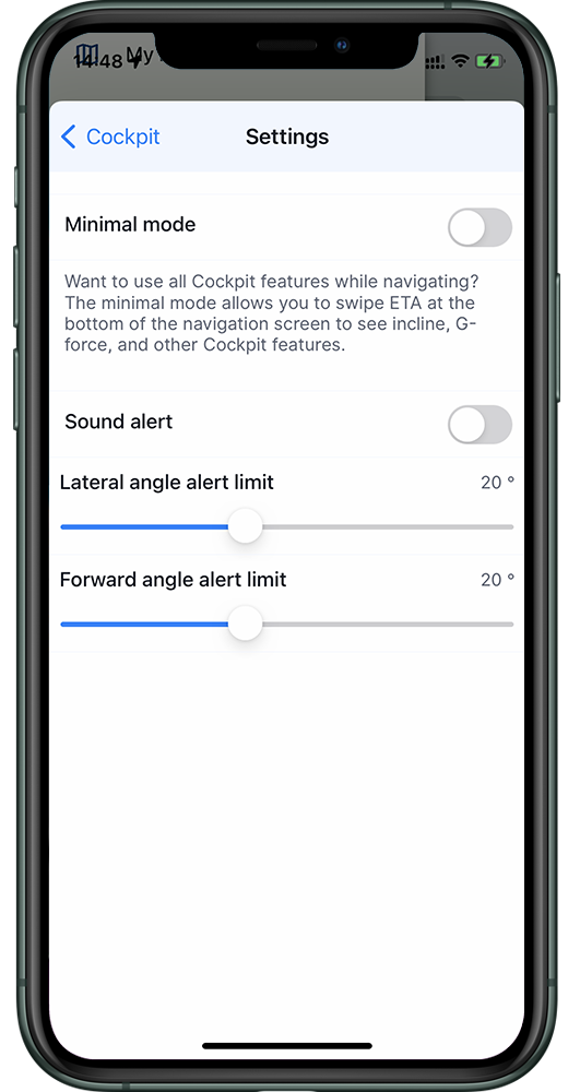 There are 2 screens in the Cockpit feature which display different stats, you can switch between them by tapping on the tabs labeled “Incline” and “G-force”.