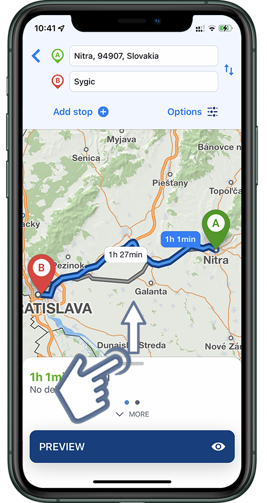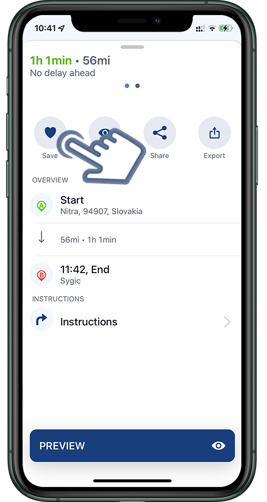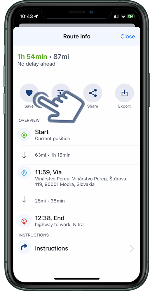 When you select your destination point and create a route, you can save it to favorites for later use. In order to create a route, please go to section Settings up your route.