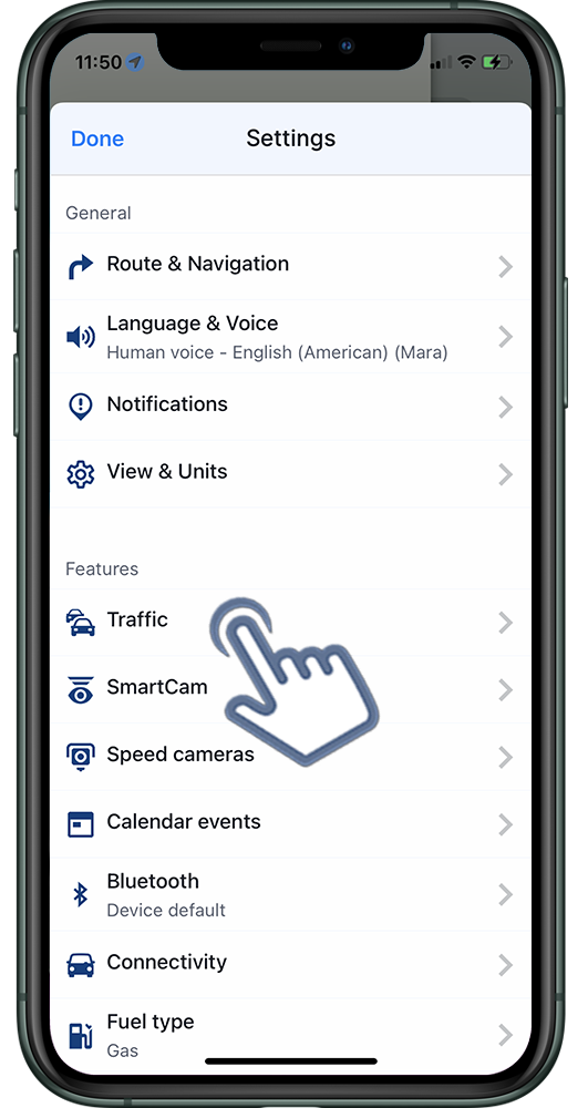 Through the Main menu → Settings → Traffic it is possible to enable/disable showing traffic.