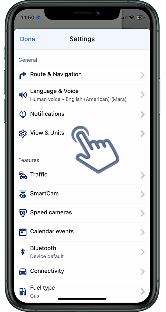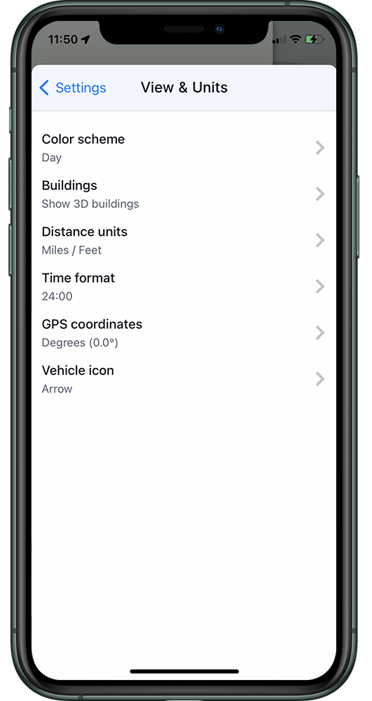 By tapping on Menu → Settings → Views & Units you can customize what details you want to see on the map and how the map looks, and also set units for the navigation.