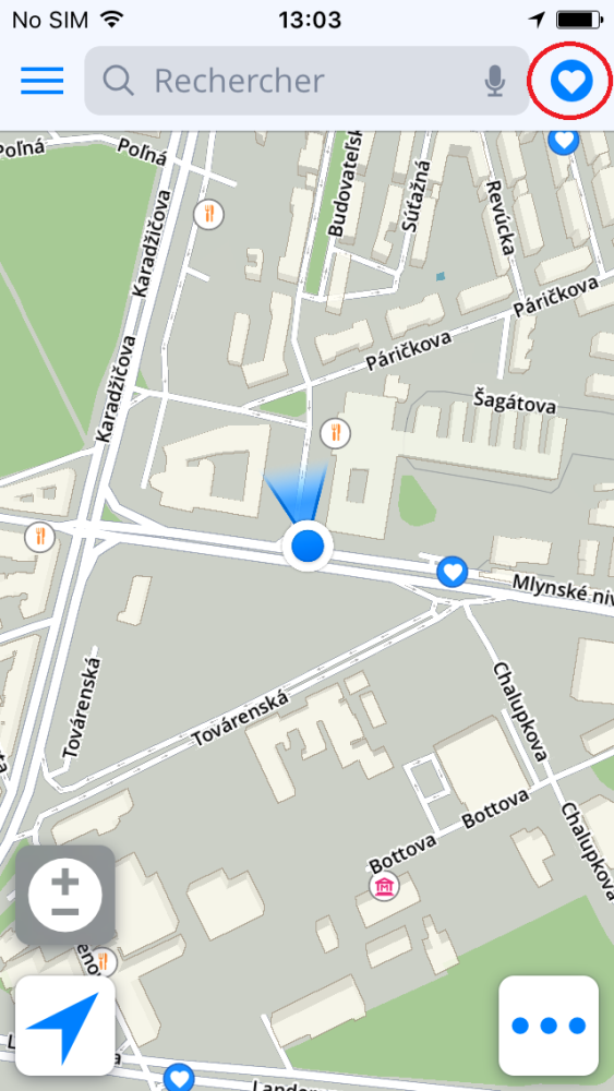 Pour la navigation vers une adresse qui est sauvée dans Favoris/Contacts, appuyez le symbole “favori” dans le coin supérieur droit sur l’écran de carte. Ensuite, vous pouvez sélectionner l’adresse.