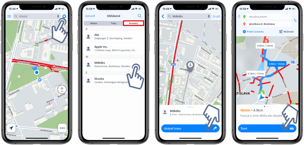 Cez ikonu Srdiečka je taktiež možné zvoliť navigovanie na adresu kontaktu uloženú na zariadení. Zvoľte záložku Kontakty, vyberte kontakt, zvoľte možnosť Ukázať trasu a spustite navigovanie tlačidlom „Štart“.