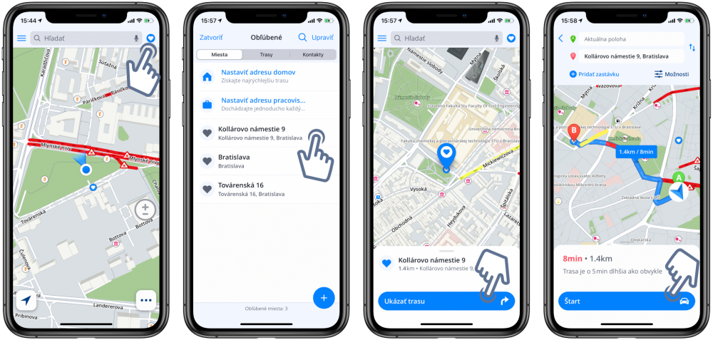 Pre navigáciu na vami uložené miesta, kliknite na ikonu Srdiečka napravo od vyhľadávacieho okna. Zobrazí sa zoznam vašich uložených Obľúbené miesta/ trasy a Kontakty