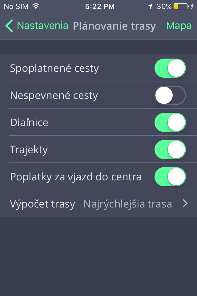 V Menu > Nastavenia > Plánovanie trasy môžete zapnúť/vypnúť prejazd cez Spoplatnené cesty, Nespevnené cesty, Diaľnice, Trajekty, Spoplatnené vjazdy do mesta pri plánovaní Vašej trasy.