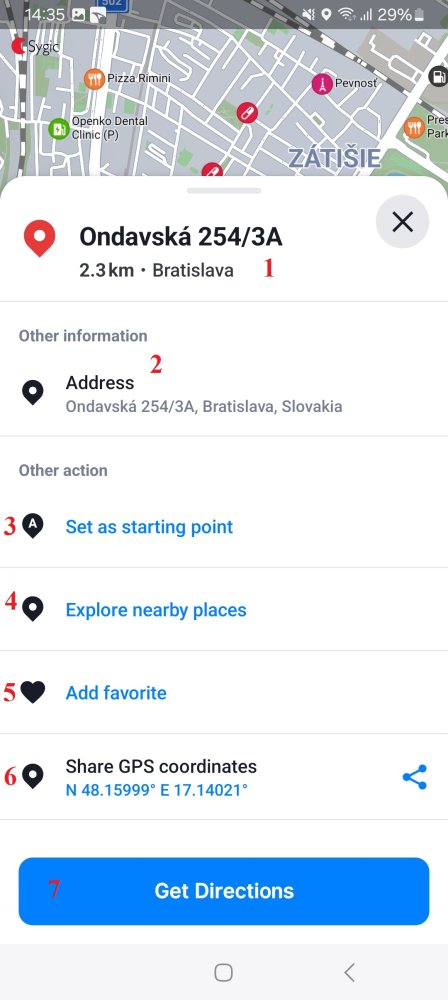 Sygic GPS Navigation by default uses your current position as the starting point when calculating a route. To change the starting point, the steps are the same as when Selecting a destination, but instead of selecting a point as the destination of your route, you simply pull up the bottom sheet with the “Get directions” button. This opens up the location detail options, where you select “Set as starting point” (3 in the screenshot below).